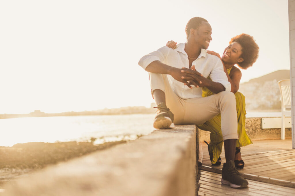 hermosa pareja africana de raza negra enamorada y de vacaciones sentada a disfrutar junto con grandes sonrisas y reír. ropas casuales como el estilo de moda con la agradable puesta de sol al fondo. tenerife.