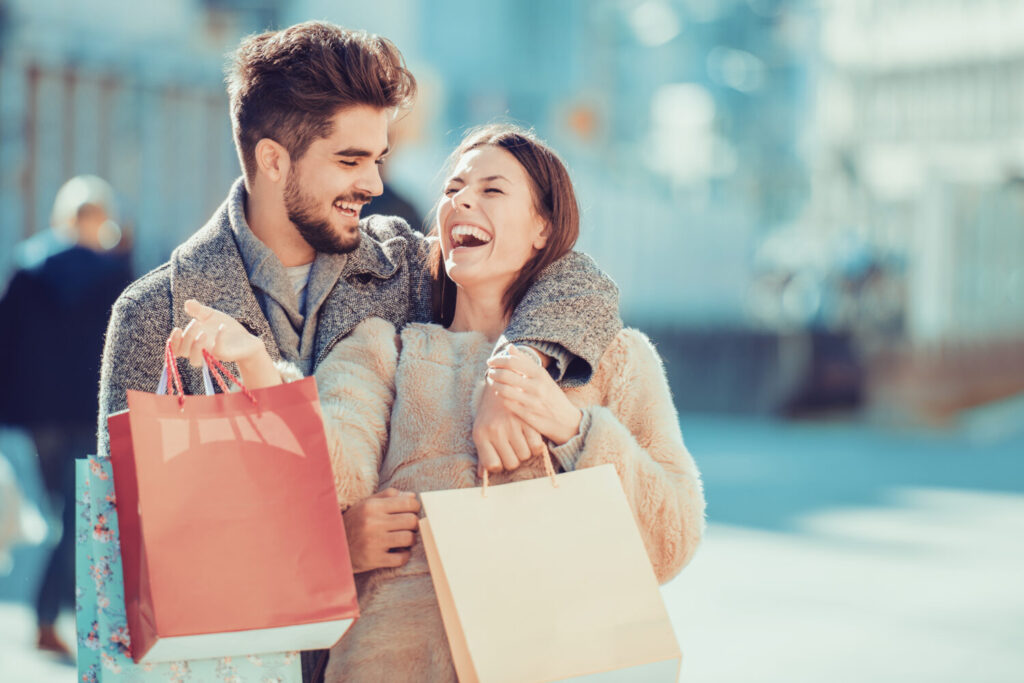 Hermosa pareja joven y amorosa que lleva bolsas de compras y disfruta juntos.