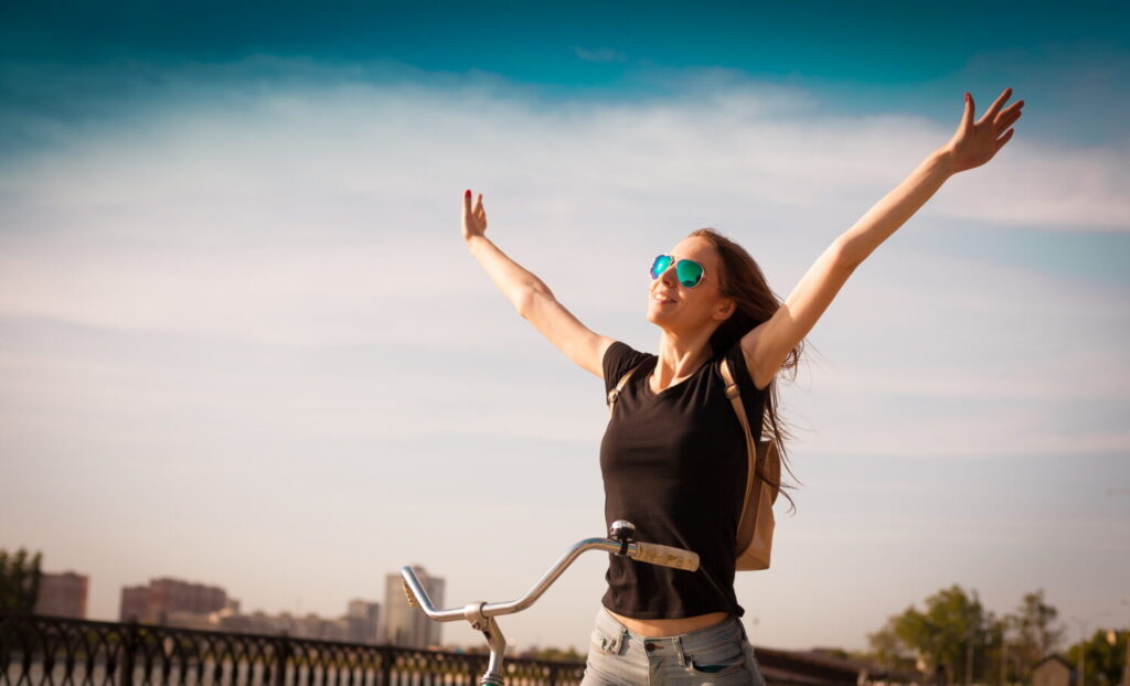 hermosa sensualidad elegancia cabellera mujer ciclista tiene alegre cara sonriente