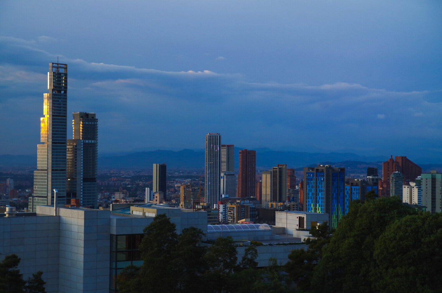 Hermosa vista exterior de uno de los edificios más altos de Bogotá, Colombia