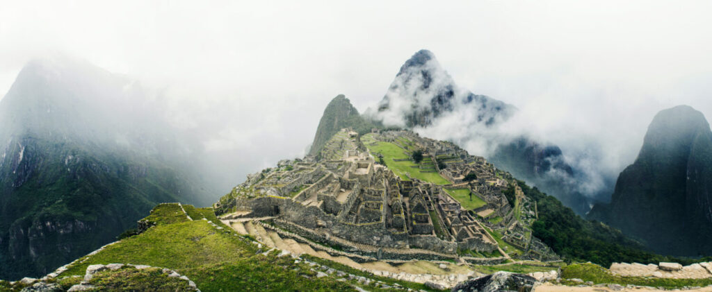 Hermoso amanecer de las ruinas de Machu Picchu en el Perú en un día nublado