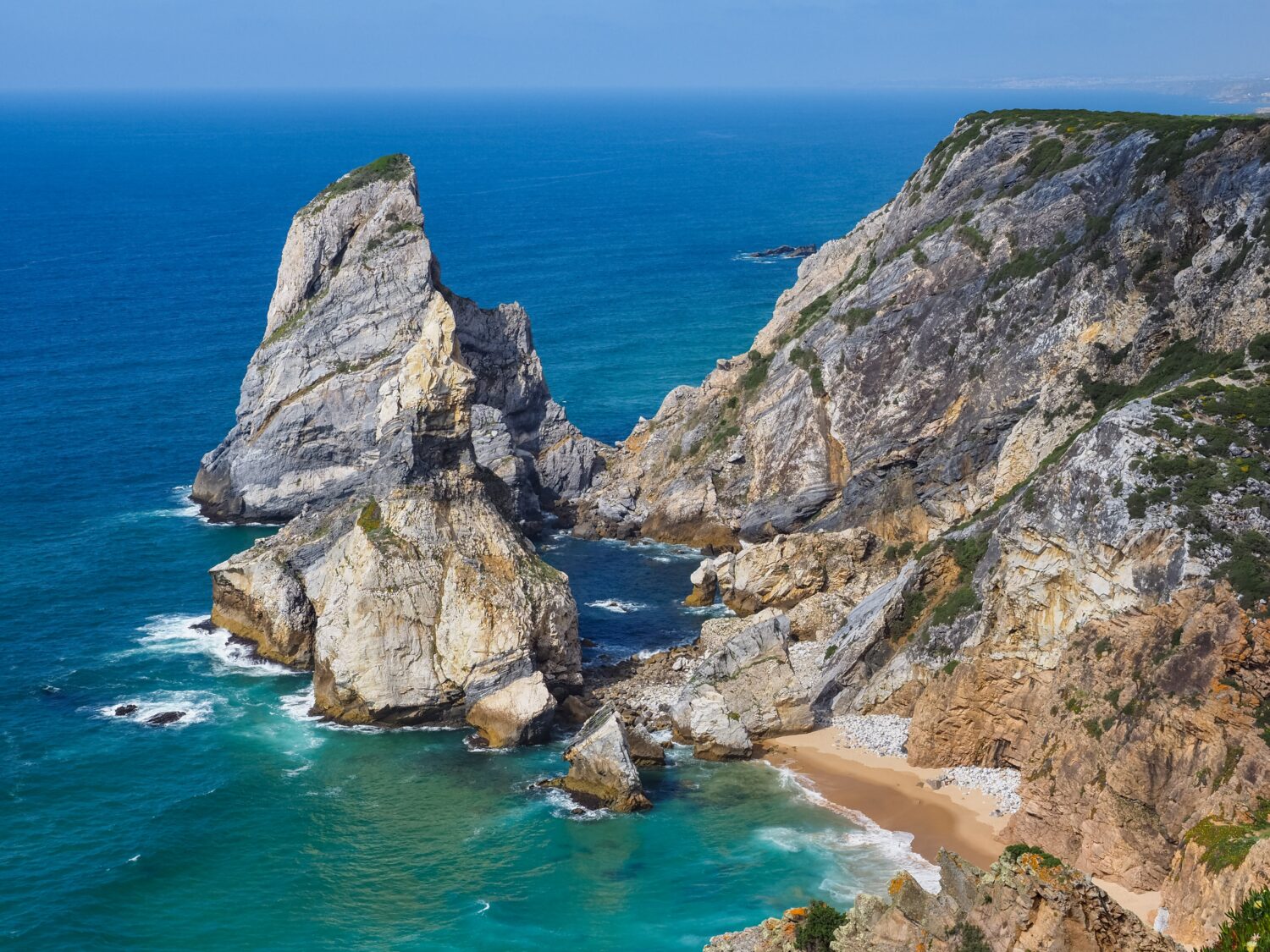 Hermoso paisaje portugués. Océano Atlántico azul y acantilados empinados. La playa de Ursa o la Praia da Ursa están al lado del Cabo da Roca, que forma parte del parque nacional. Famosa y popular atracción turística en Portugal