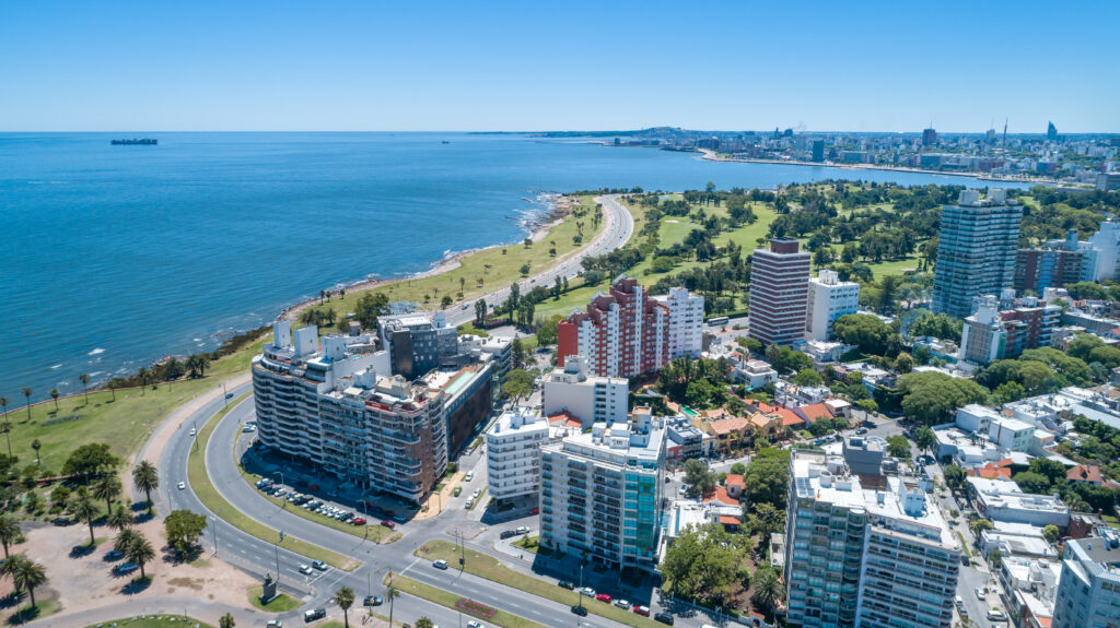 High angle view of Montevideo’s coastline, drone point of view, Punta Carretas neighbourhood, Uruguay.
