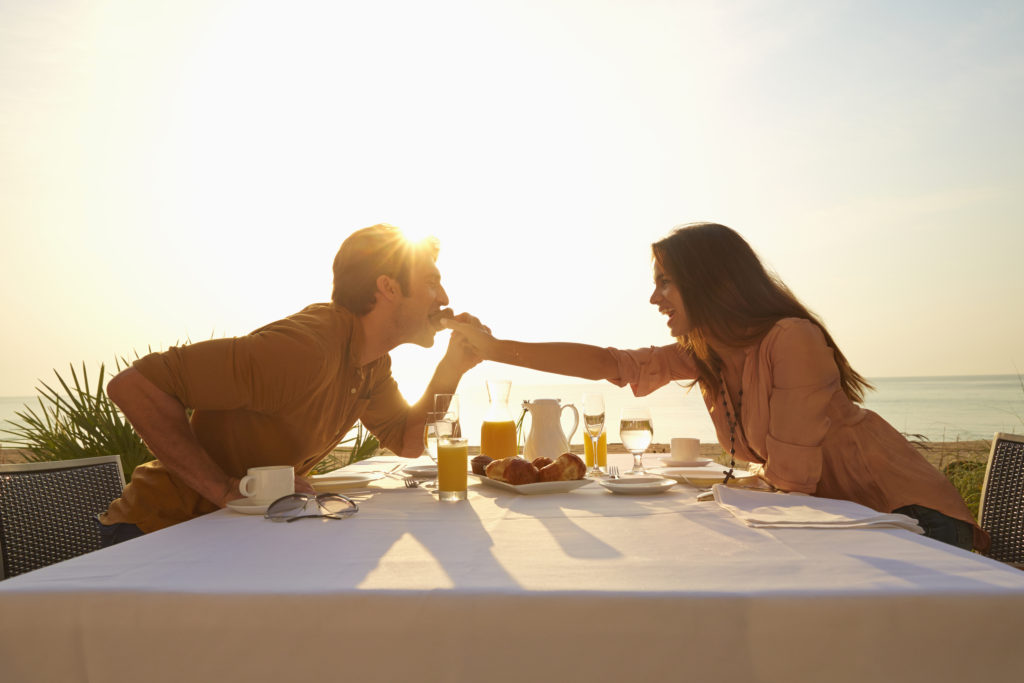 Hispanic woman feeding man at sunset dinner outdoors
