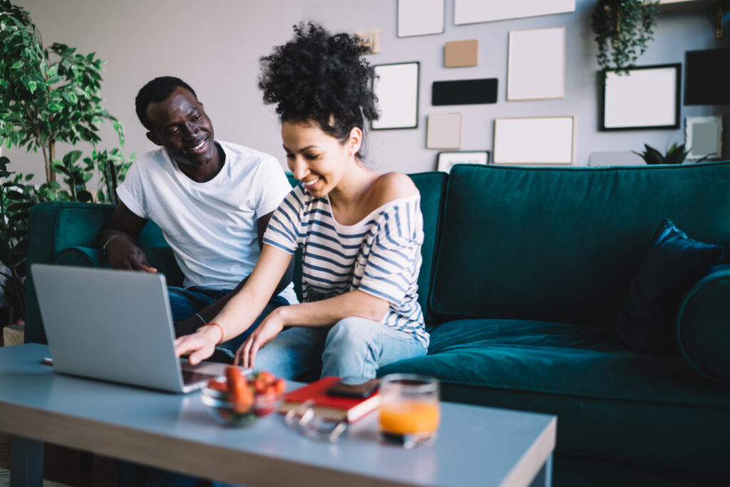 Hombre afroamericano con camiseta blanca sonriendo mirando a una atractiva joven mujer étnica usando una laptop sentada en un sofá suave en casa