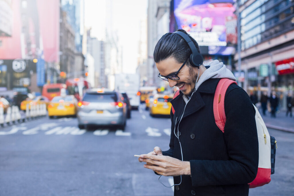 hombre caminando en nueva york con audifonos y telefonos inteligentes