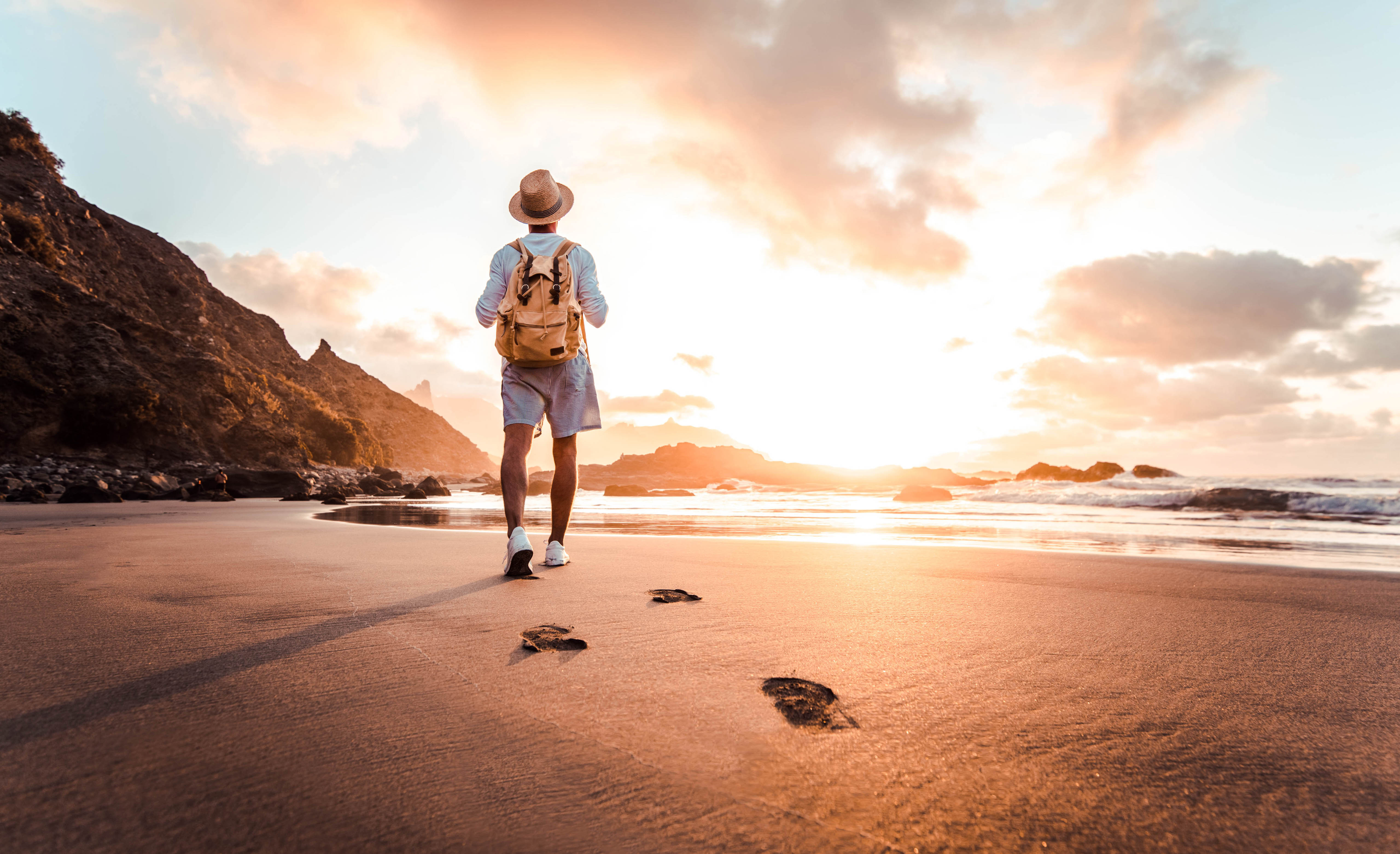 Hombre con mochila caminando en la playa al atardecer – Concepto de estilo de vida de viaje – Filtro de oro