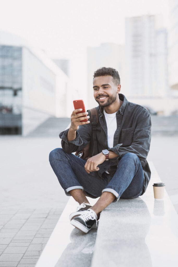 hombre de estudiante guapo que usa smartphone en una ciudad