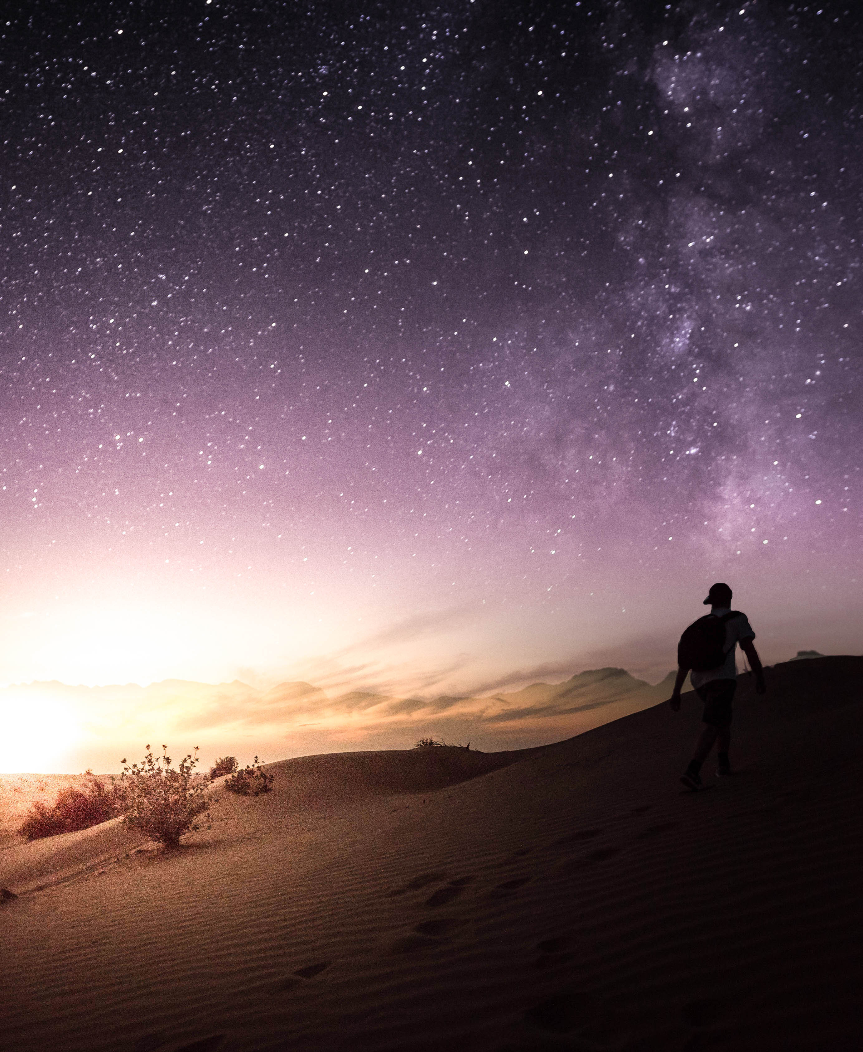 Hombre en el desierto con cielo nocturno durante el atardecer, Dubai