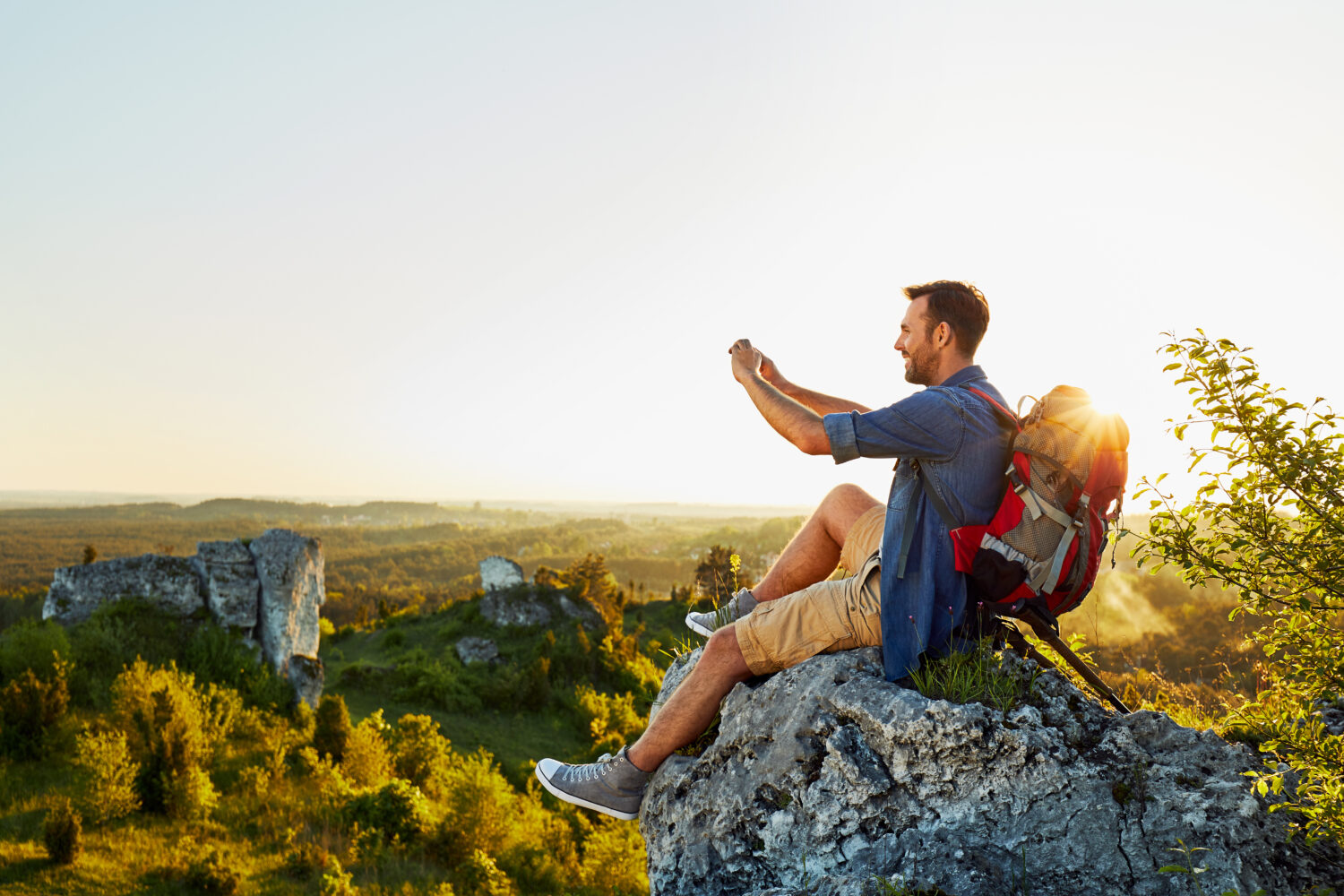 hombre haciendo senderismo tomando foto con telefono movil sentado encima