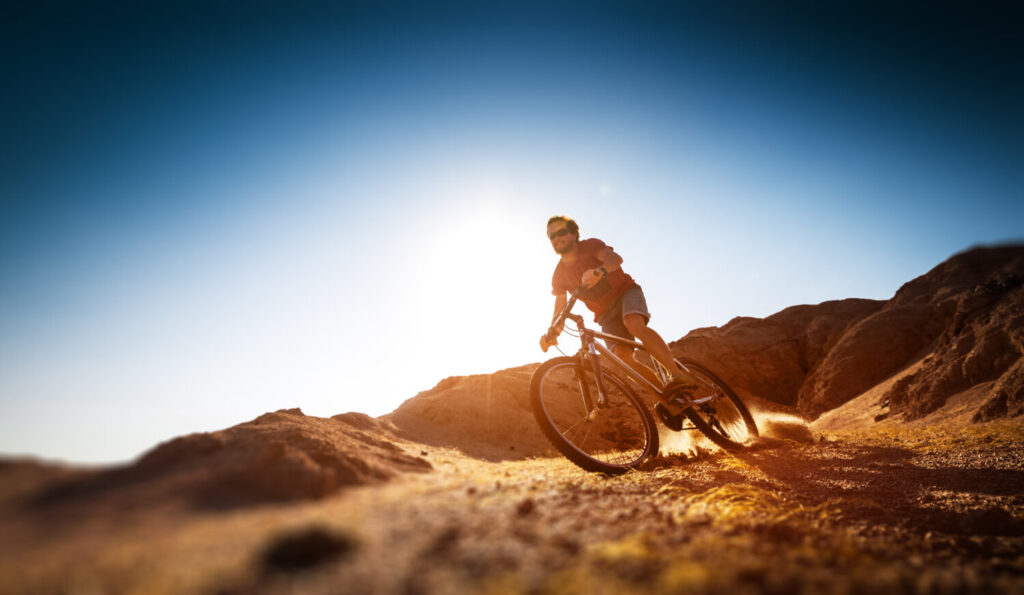 Hombre monta bicicleta en el desierto seco