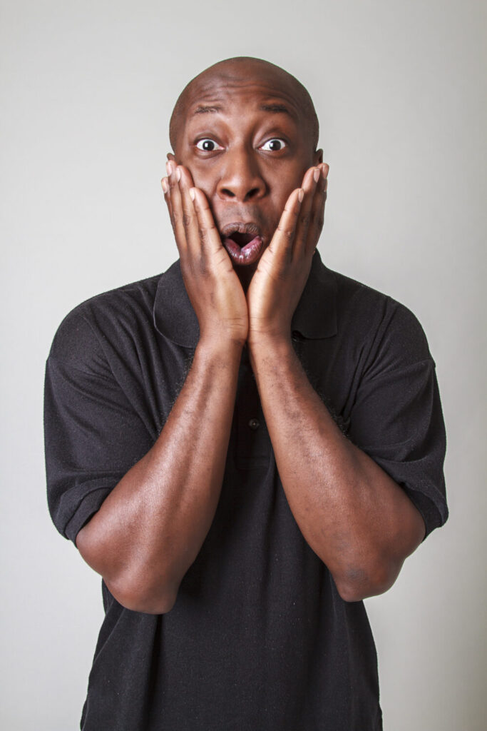 hombre negro calvo de cuarenta años sosteniendo su cara con expresión de sorpresa