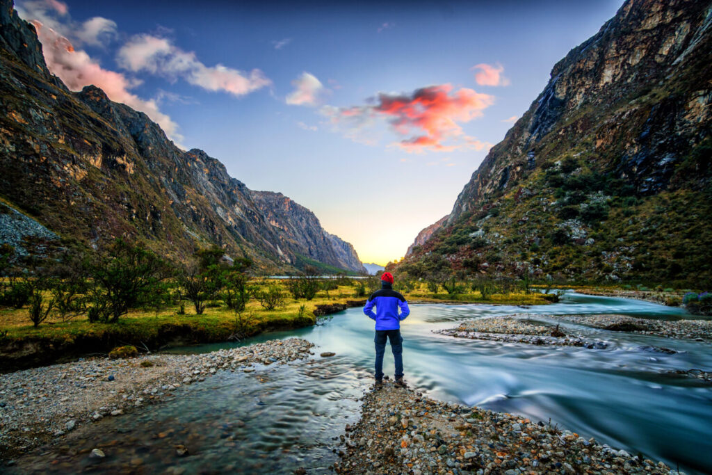 Hombre parado a orillas de un río mirando a un hermoso valle de montaña durante el atardecer con una nube rosa – Ubicación: Trekking Santa Cruz, Ancash, Perú, Sudamérica