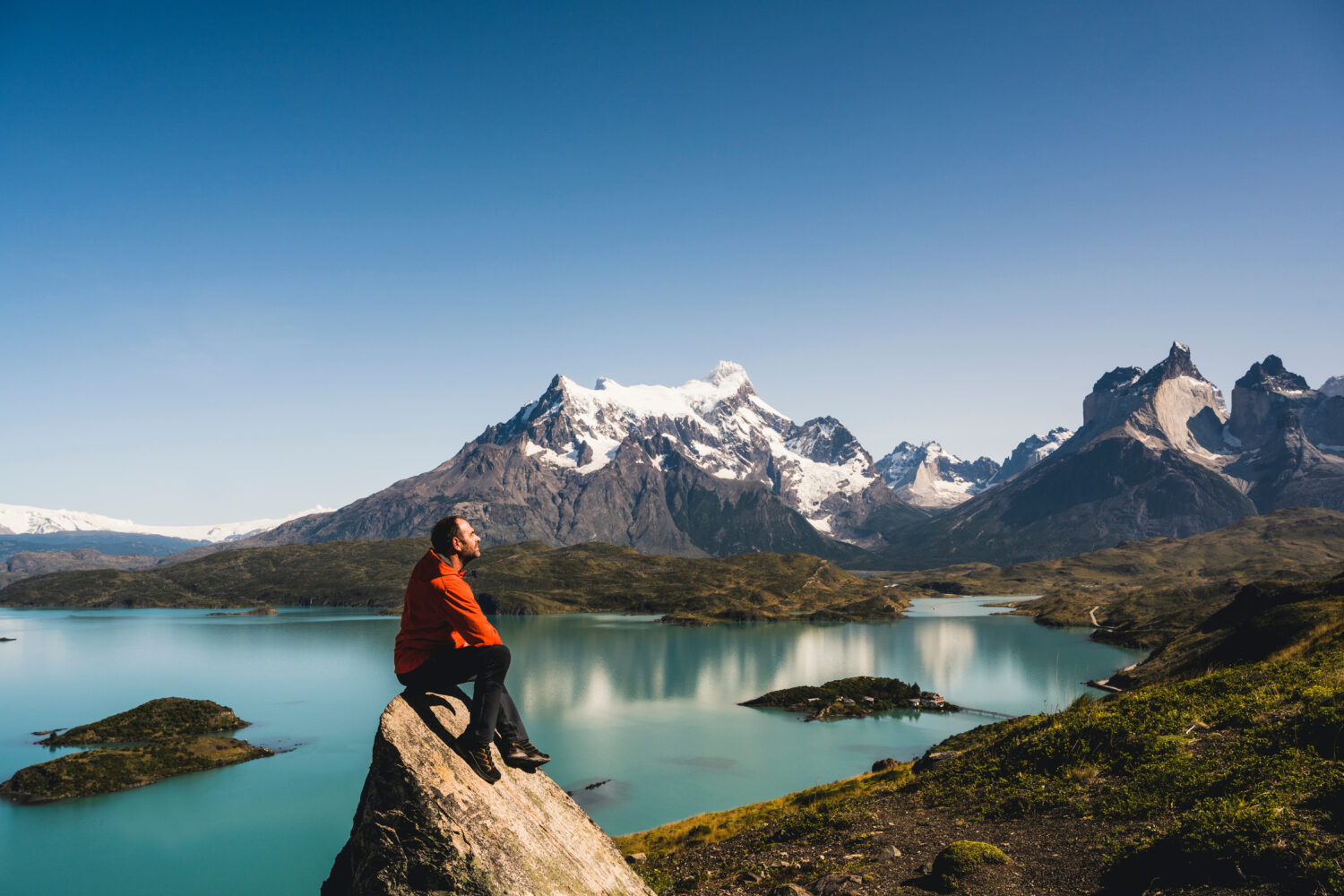 Hombre sentado en una roca en el lago Pehoe en el Parque Nacional Torres Del Paine – Chile Patagonia-Sudamérica
