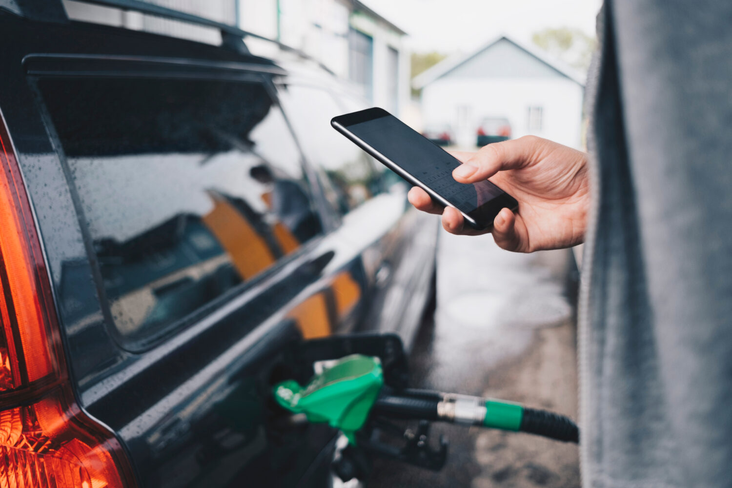 Hombre usando teléfono móvil mientras recarga el auto en una gasolinera