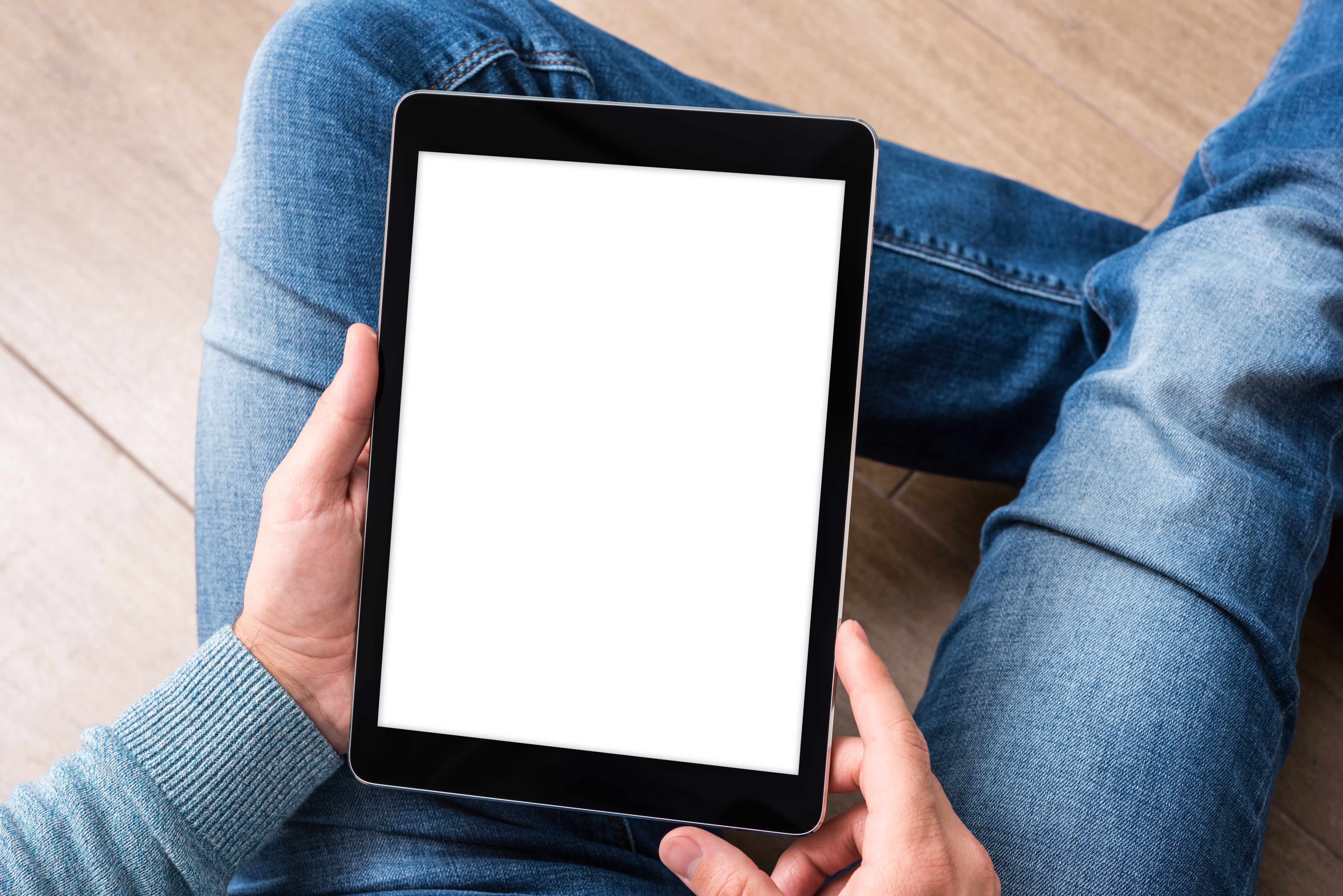 Hombre usando una tableta mientras está sentado en un suelo de madera. Vista desde arriba. Ruta de recorte incluida.