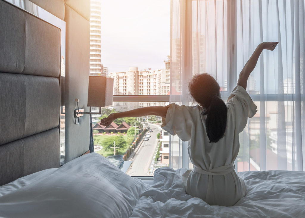 Hotel room comfort with good sleep easy relaxation lifestyle of Asian girl on bed have a nice day morning waking up, taking some rest, lazily relaxing in guest bedroom in city hotel