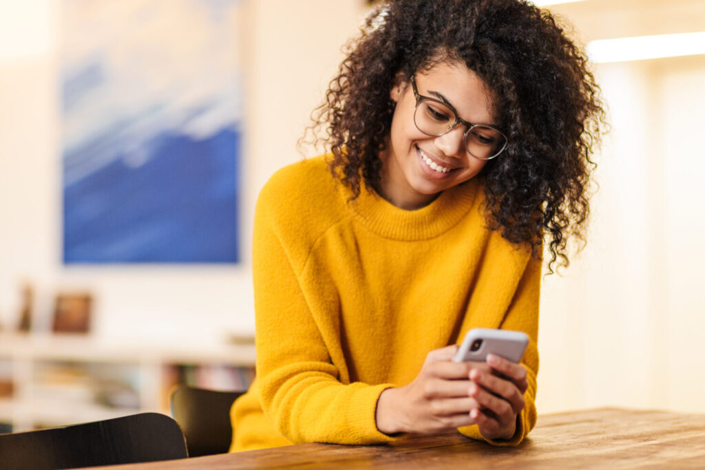 imagen de una feliz afroamericana con anteojos usando un smartphone