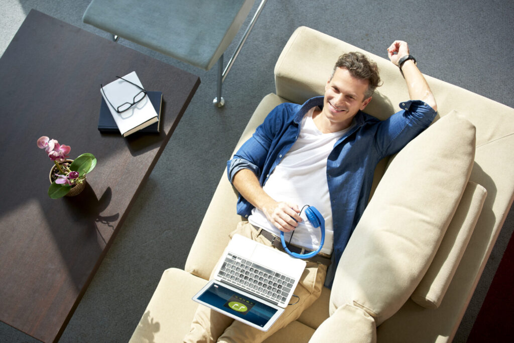 Imagen en gran angular de un hombre de mediana edad dando una siesta en el sofá de casa y escuchando música.