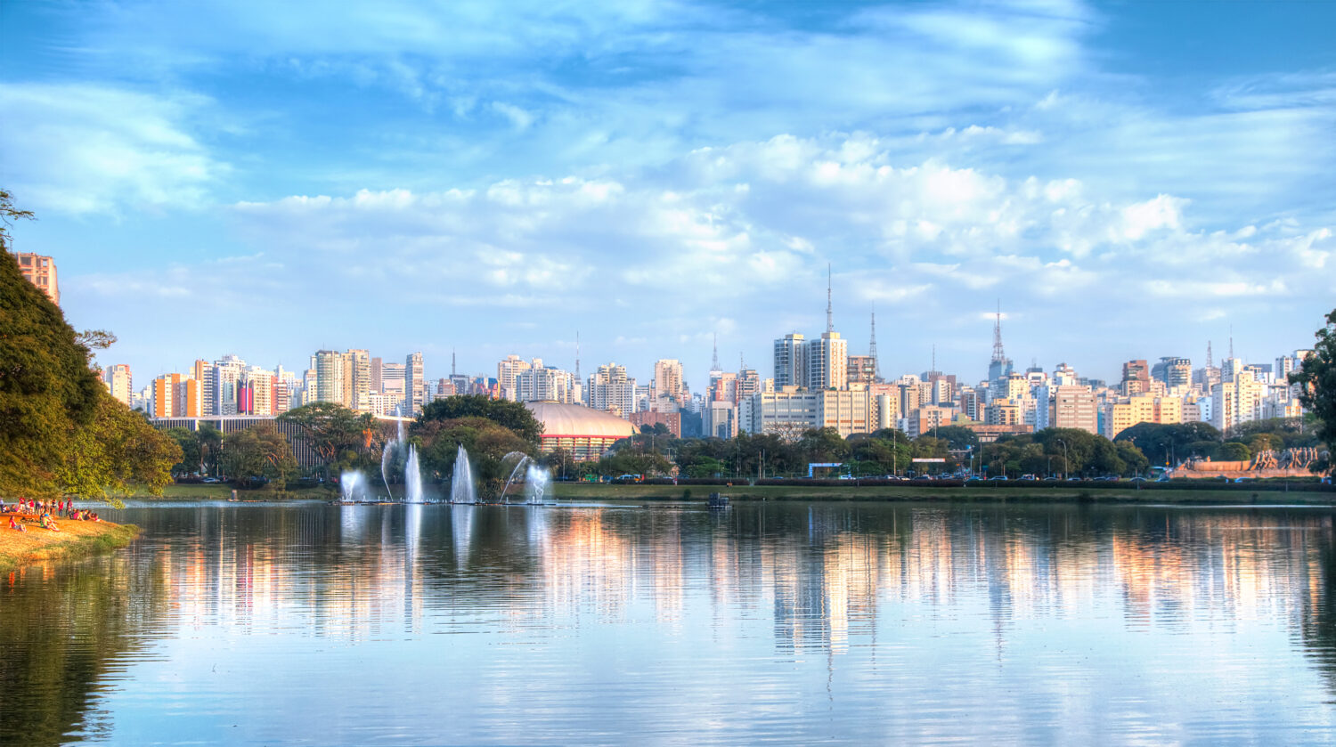 Increíble vista de la ciudad de São Paulo desde el Parque Ibirapuera , Brasil. Ibirapuera es uno de los parques urbanos más grandes de América Latina.
