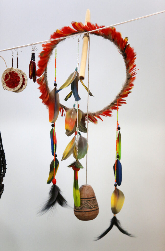 Handemade necklaces, earring and tiaras made by indigenous people with amazon birds feathers exposed for sale at a fair in Belem