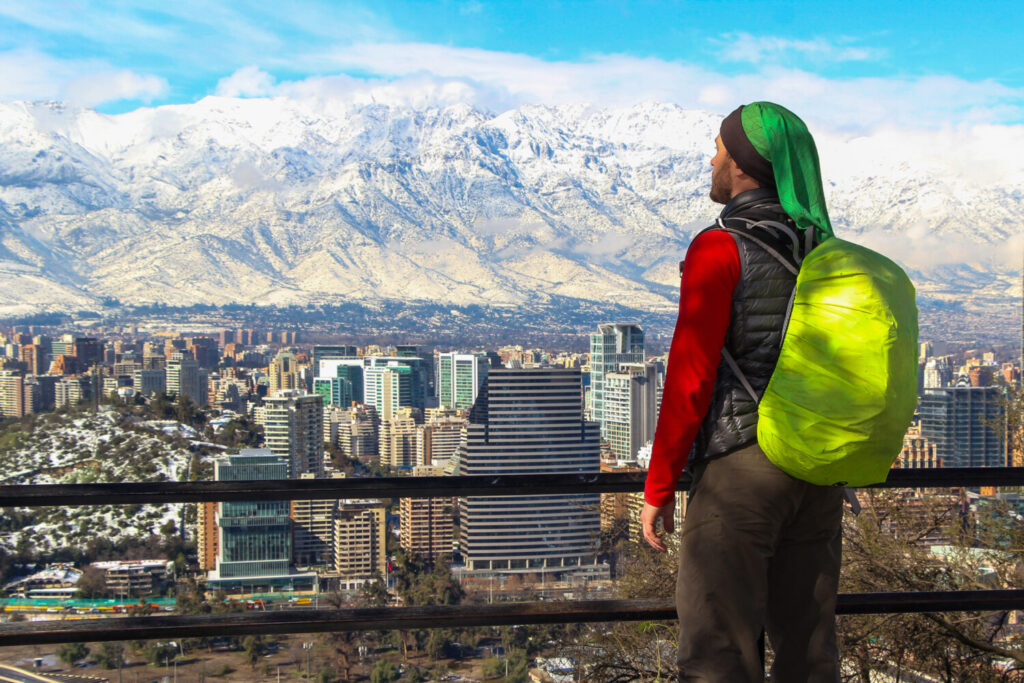 Invierno y nieve en Santiago. El turista mira la zona de Providence. Chile 2017
