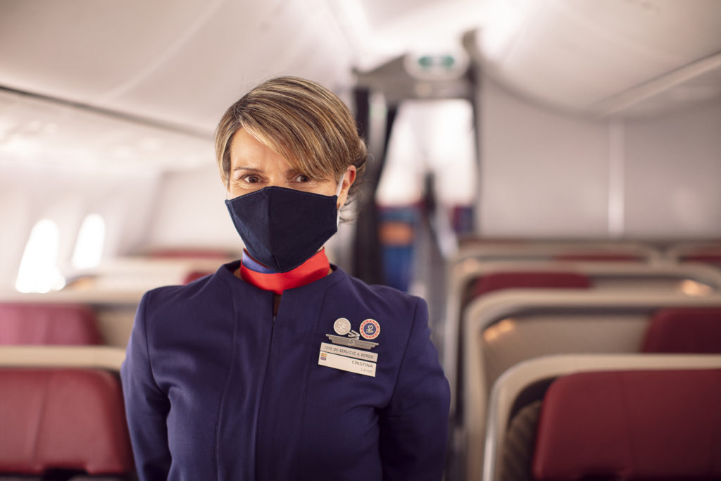 Jefa de servicio a bordo con mascarilla en cabina business