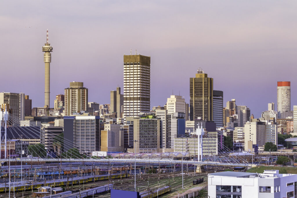 Johannesburg cityscape with at sunset, showing the Nelson Mandela Bridge. Braamfontein suburb and the railway line leading to Park Station with eight lanes of trains. The iconic telkom communication tower and Ponte flats.