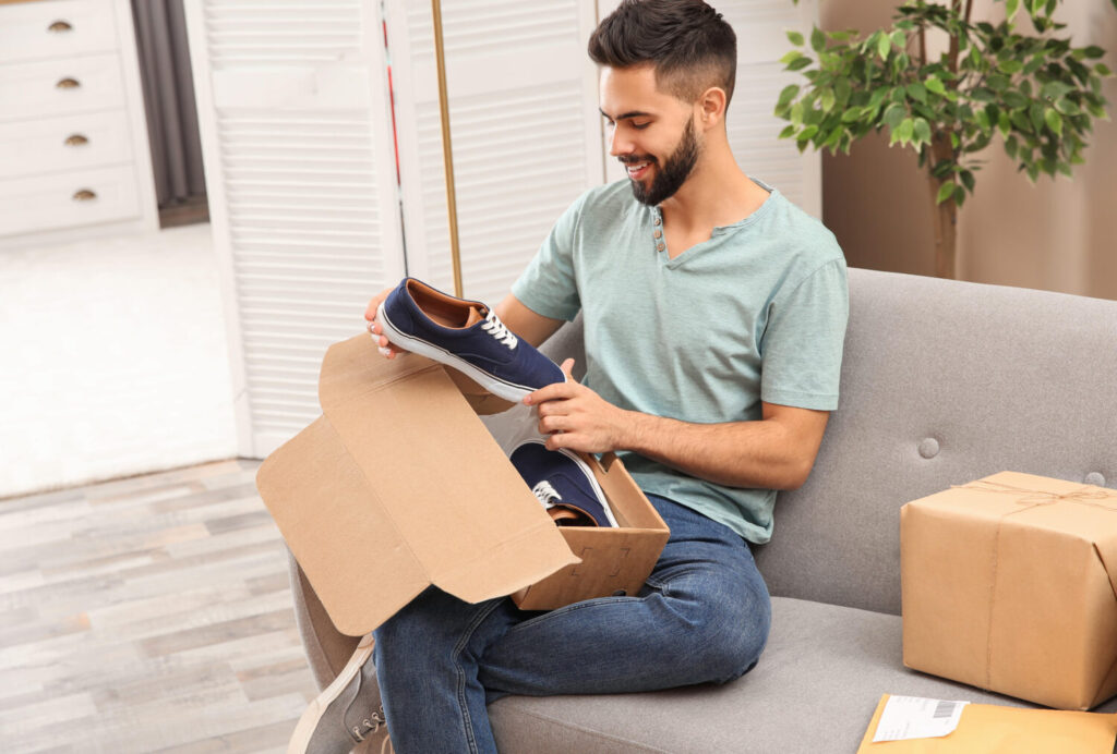 joven abriendo paquete con zapatos en el sofa en casa ID: 83938 Joven abriendo paquete con zapatos en el sofá en casa