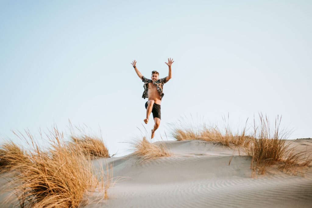 Joven alegre saltando sobre la arena en el desierto de Almería-Tabernas-España