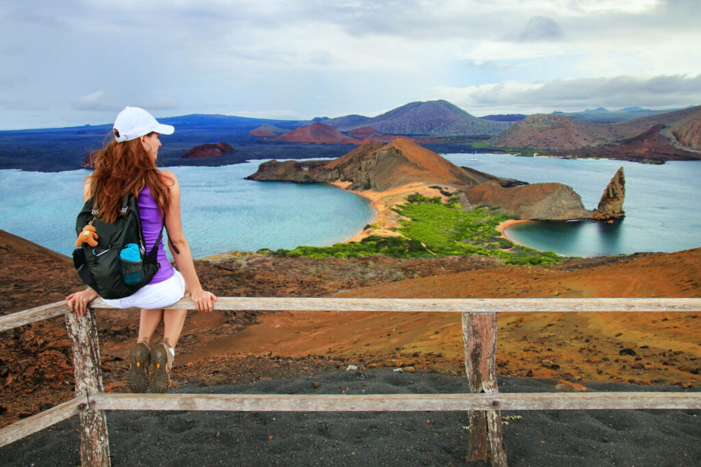 Joven disfrutando de la vista de Pinnacle Rock en la isla Bartolomé, Parque Nacional Galápagos, Ecuador. Esta isla ofrece algunos de los paisajes más bellos del archipiélago.