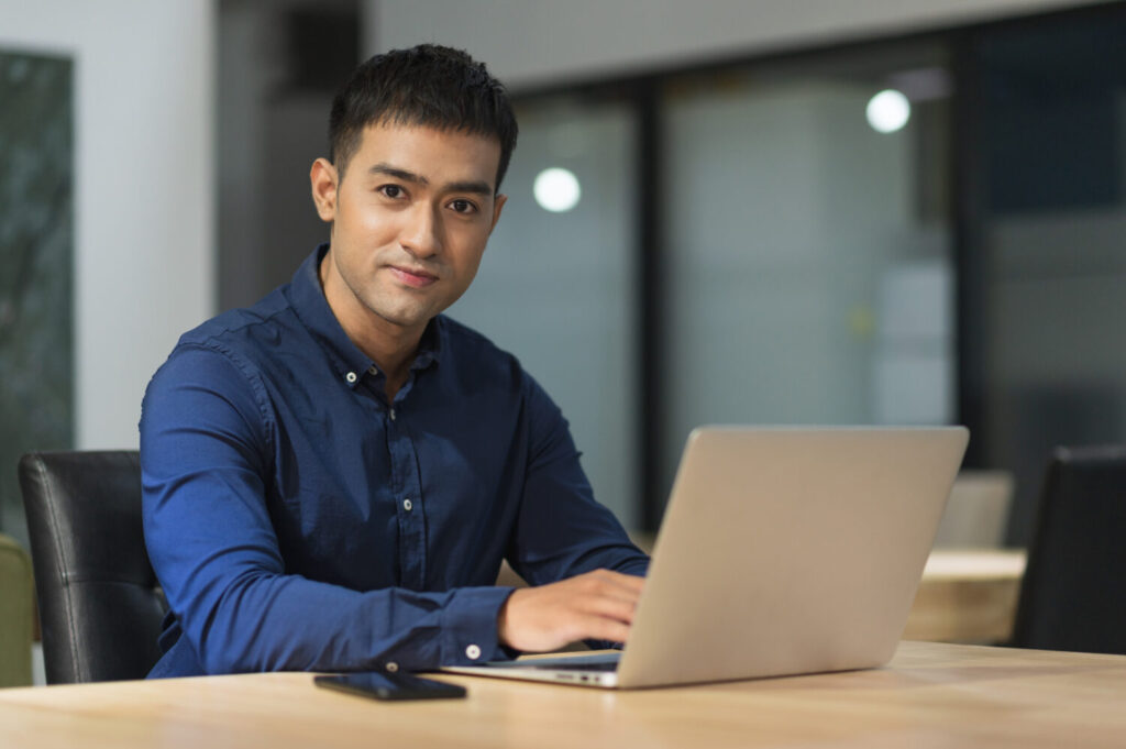Joven empresario asiático trabajando con una laptop en la oficina.