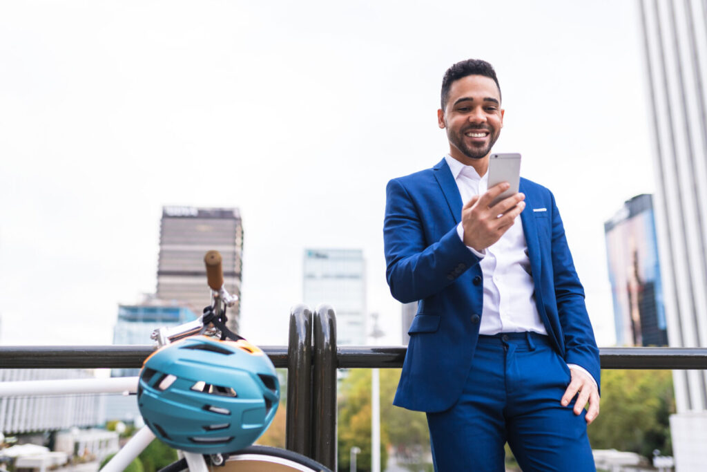 Joven empresario latino que usa celulares mientras camina con su bicicleta. Hombre de negocios latino usando teléfono móvil al aire libre. Concepto de negocio.