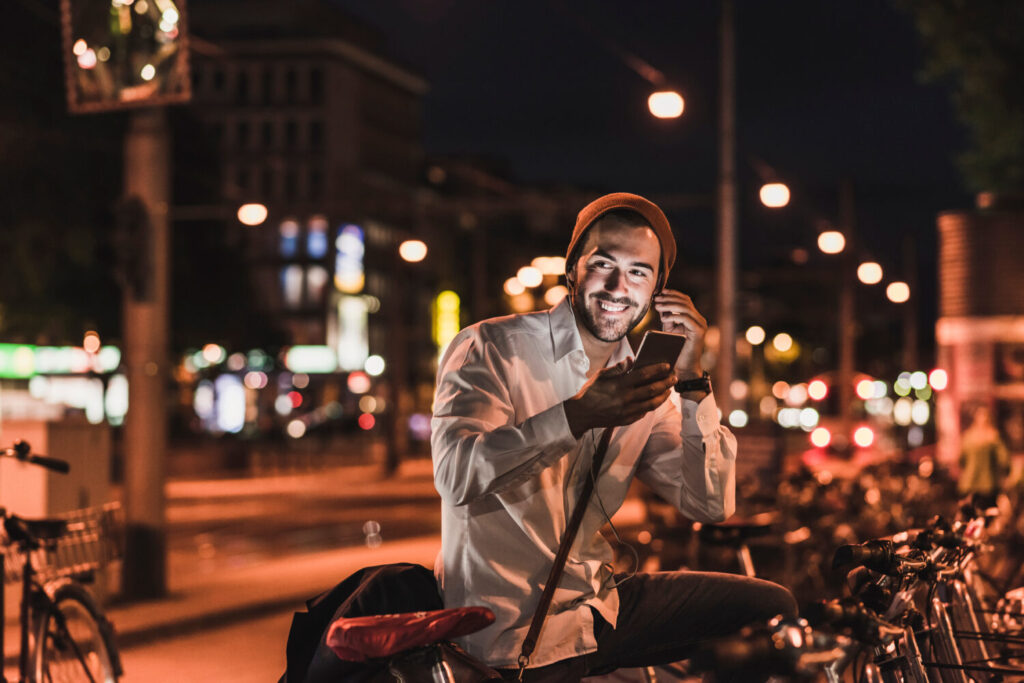 joven en la ciudad con audifonos y telefono celular por ID: 81253 Joven en la ciudad con audífonos y teléfono celular por la noche