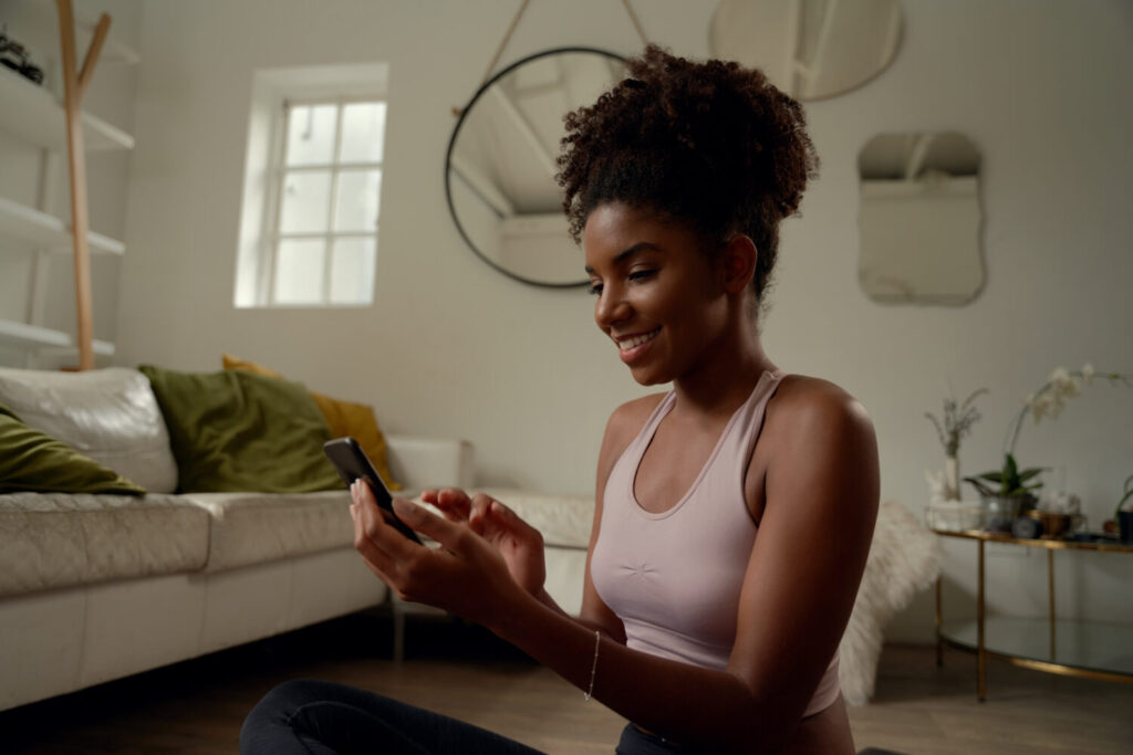 joven feliz haciendo yoga y usando el telefono celular sentado