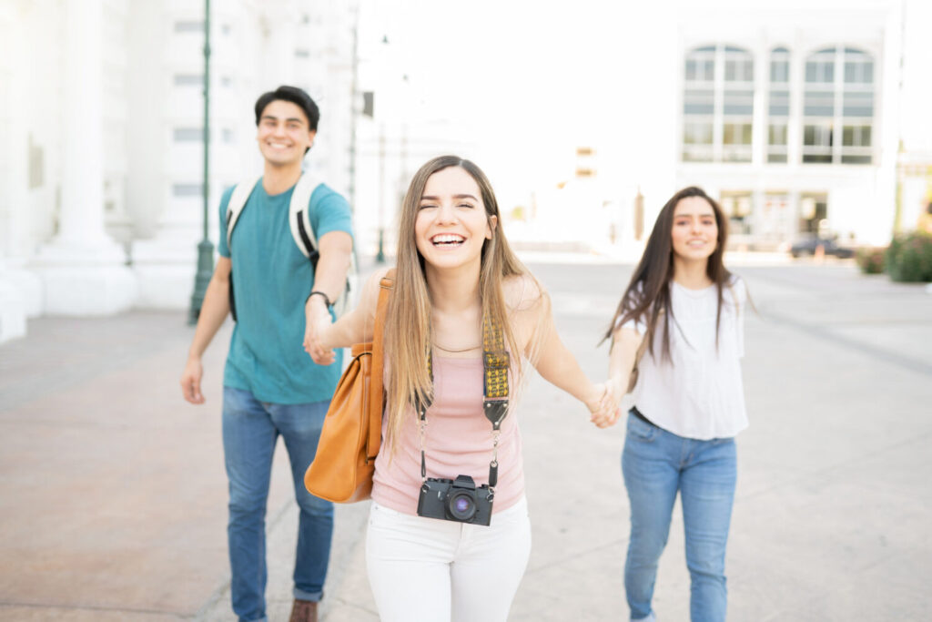 Joven feliz tomando la mano de sus amigos mientras camina por la ciudad durante el viaje