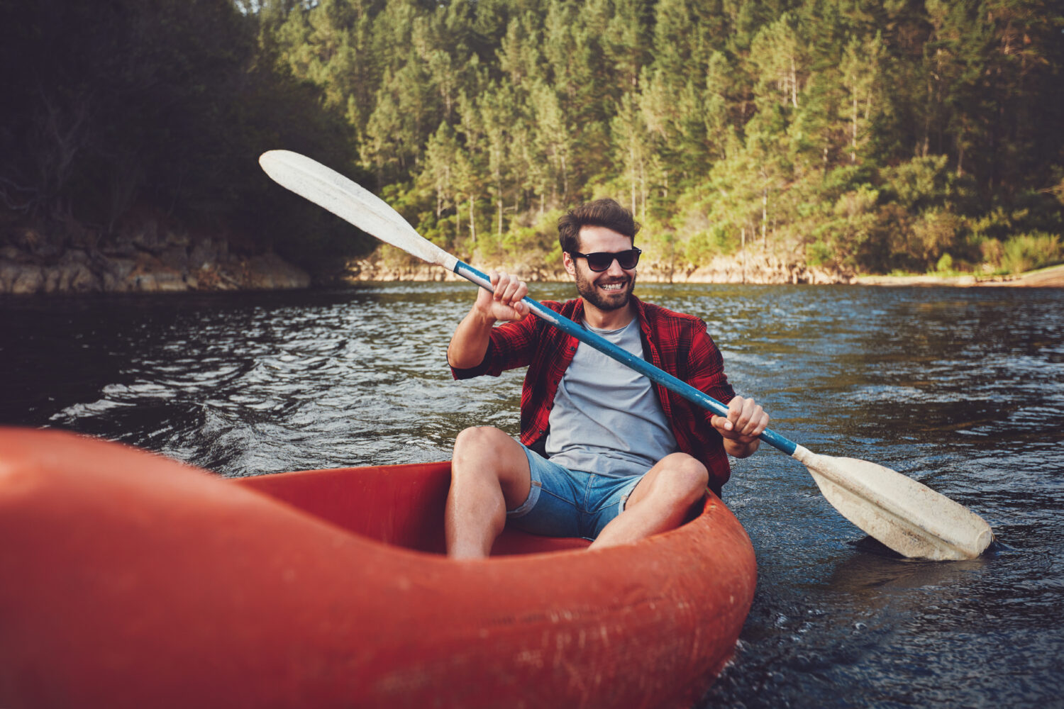 Joven haciendo kayak en un lago. Feliz hombre joven canoteando en un lago.