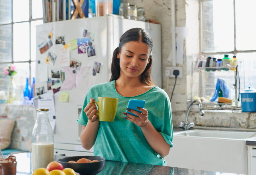 Joven hispana sonriendo con un teléfono móvil azul sosteniendo un café con uñas pintadas en casa en la cocina usando pijamas