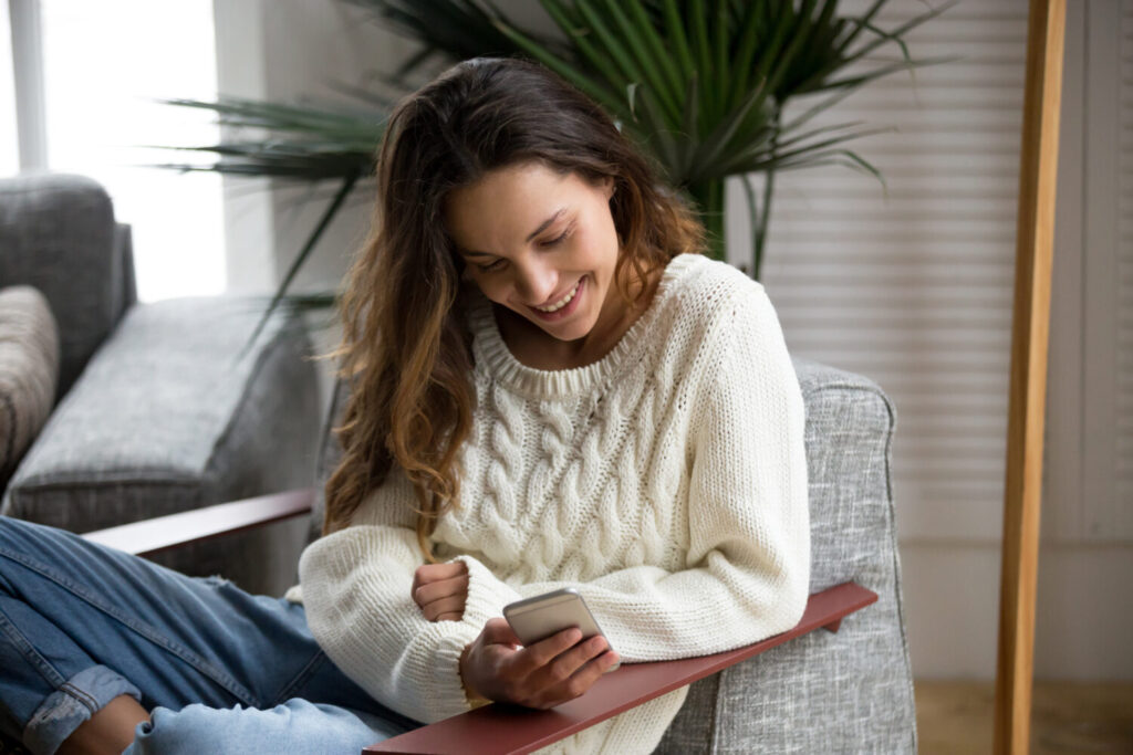 Joven joven joven sonriente que sostiene un smartphone relajándose en un sillón, revisando las noticias de las redes sociales en línea, leyendo mensajes de texto en un celular o usando una aplicación en un teléfono móvil nuevo en casa