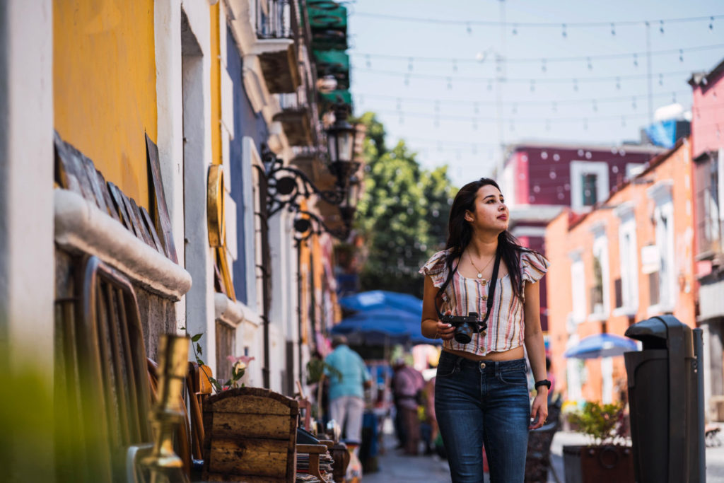 Joven mexicana caminando por las calles de la ciudad. lleva una cámara en la mano y mira la ciudad