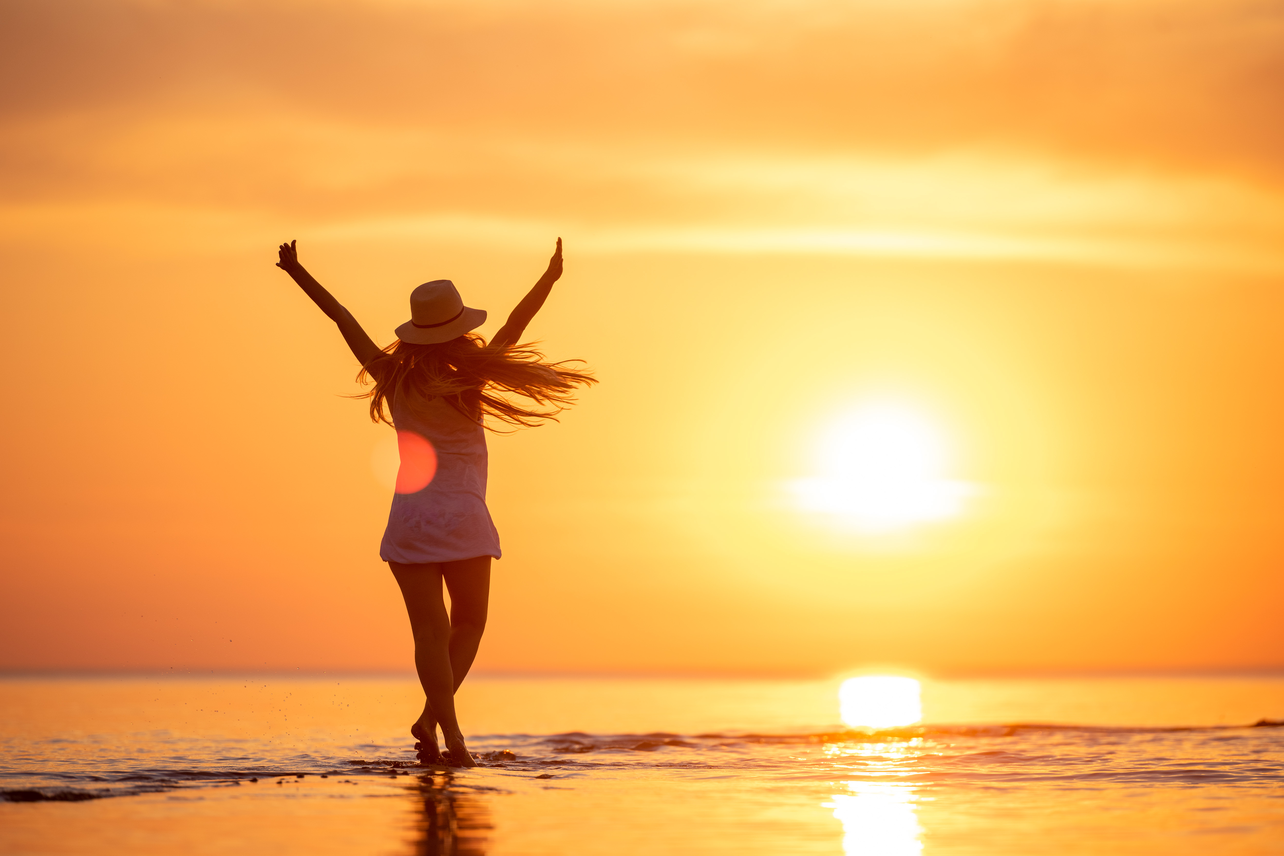 Joven niña feliz de pie o bailando en la playa de la puesta de sol con los brazos levantados