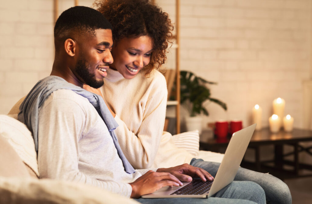 joven pareja casada usando laptop en la acogedora noche de