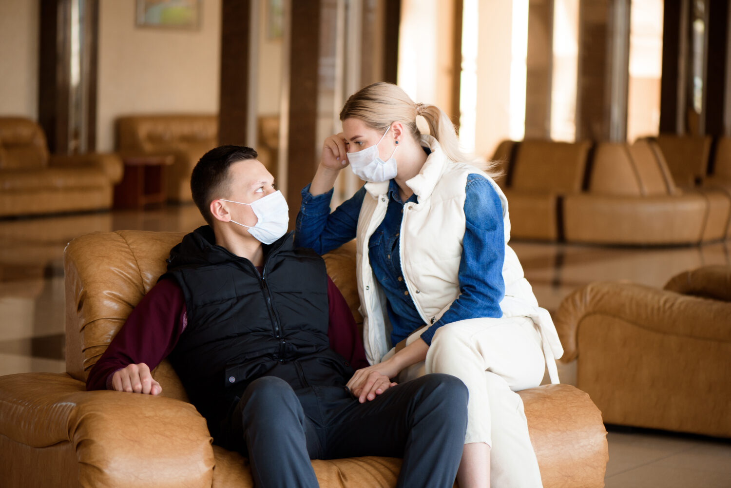 Joven pareja con una máscara en un salón del aeropuerto. Concepto de viaje del virus de la gripe coronavirus