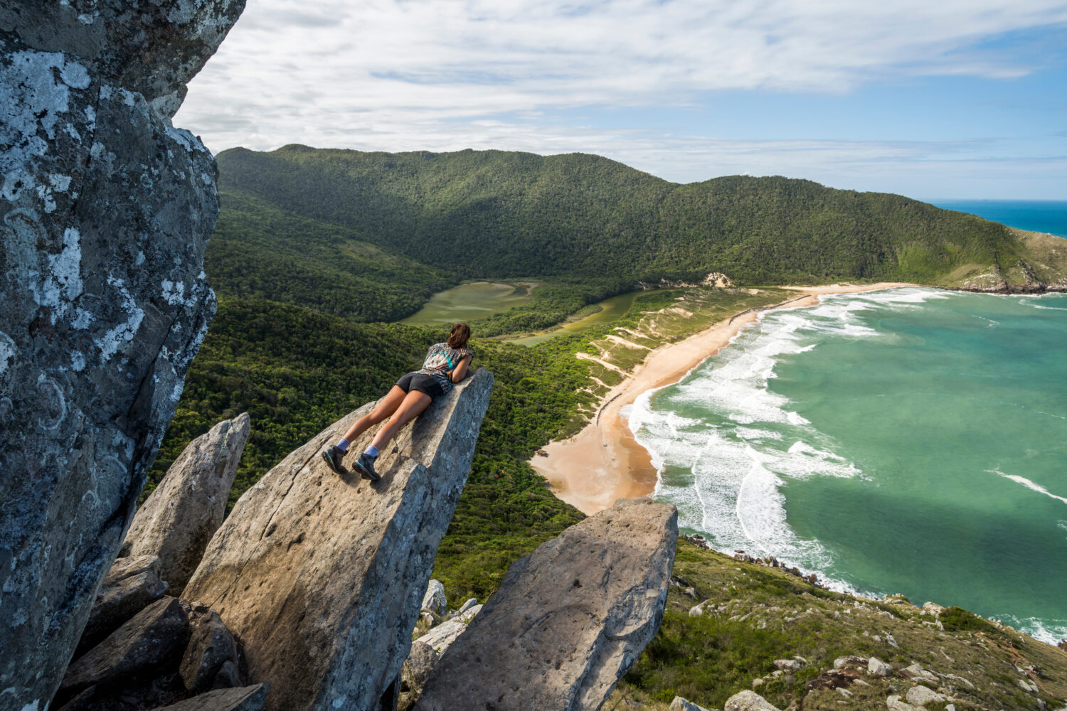 Joven tirada al borde de la roca con vistas desde la colina de Pico da Coroa hasta la playa de Lagoinha do Leste, Florianopolis, Isla Santa Catarina, Brasil