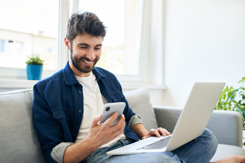 joven trabajando en casa usando laptop y smartphone ID: 81457 Joven trabajando en casa usando laptop y smartphone