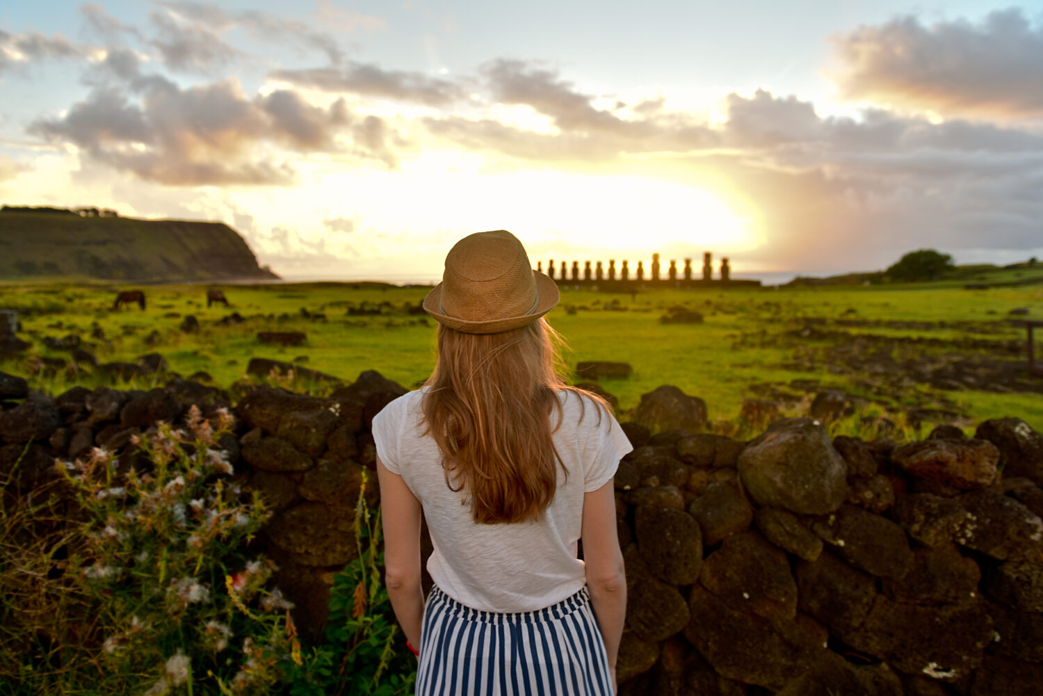 joven turista con sombrero mirando el amanecer y ahu tongariki
