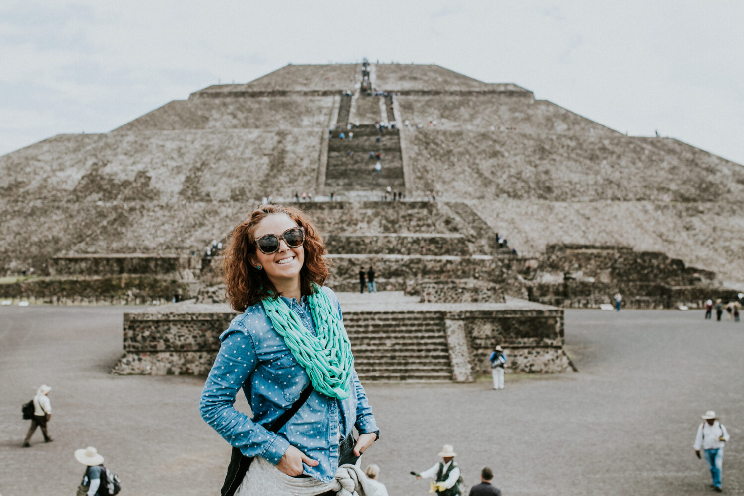 joven turista despreocupada disfrutando de las piramides de teotihuacan en