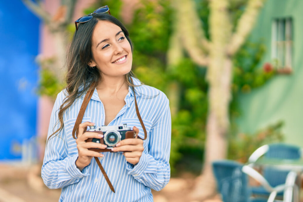 joven turista hispana sonriendo feliz usando una camara vintage en