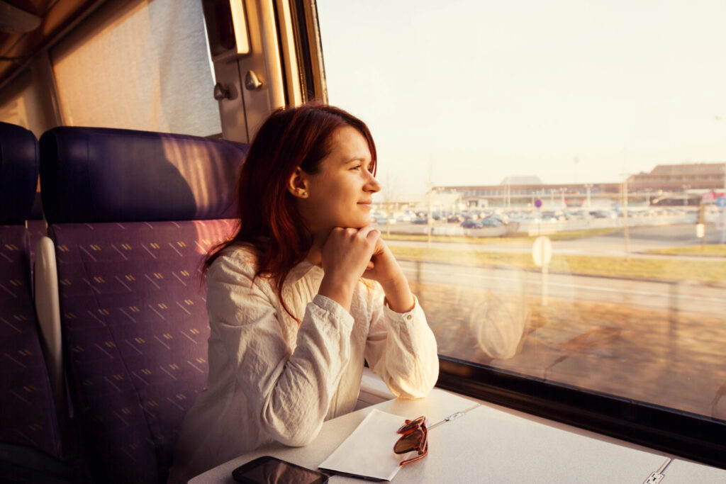 joven viajando mirando por la ventana mientras se sienta en ID: 90240 Joven viajando mirando por la ventana mientras se sienta en el tren.