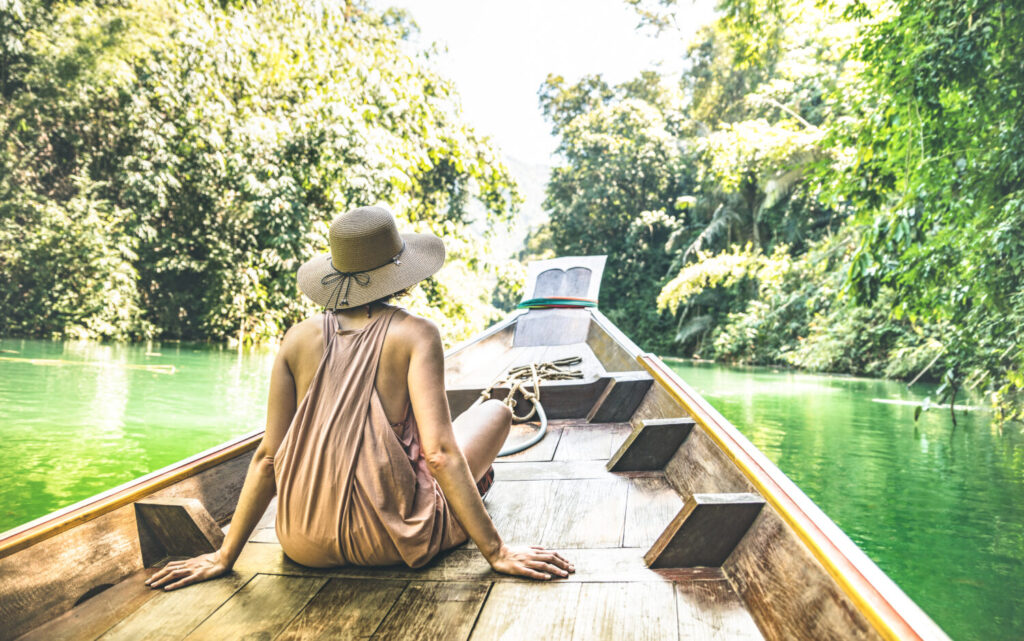 Joven viajera en un largo viaje en barco por la isla saltando en el lago Cheow Lan – Wanderlust y concepto de viaje con una aventurera turista vagabunda en excursión en Tailandia – Caluroso filtro verdoso